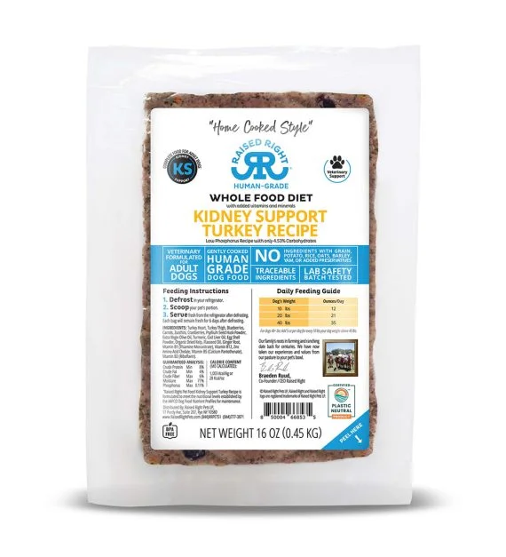 Our Kidney Support Turkey Adult Dog Recipe is formulated to meet the nutritional levels established by the AAFCO Dog Food Nutrient Profiles for maintenance. Calorie content (ME Calculated): 28 kcal / oz (1,003 kcal / kg)